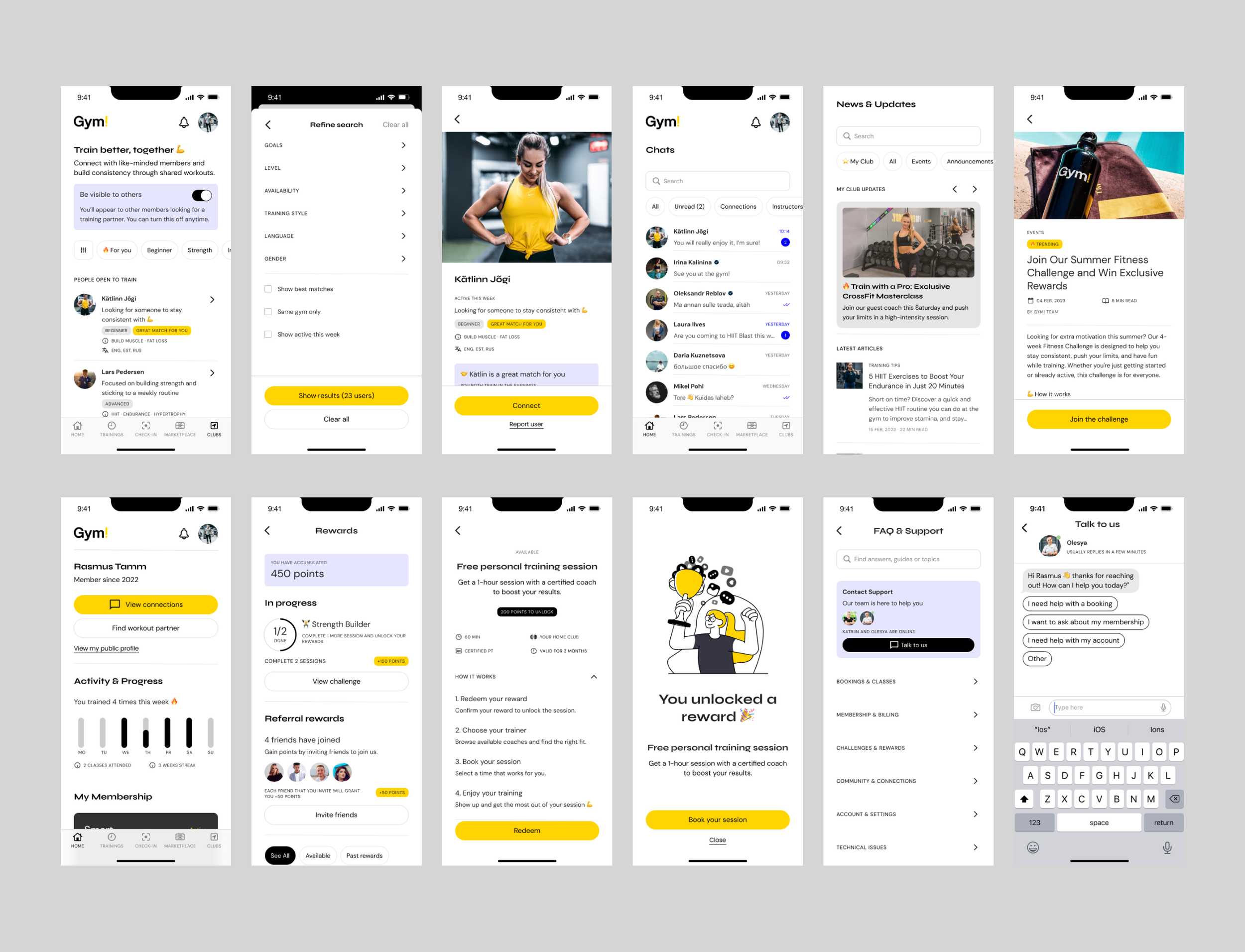 The existing Gym! mobile app fulfilled basic functional requirements—membership access, class booking, and general information—but lacked cohesion and strategic depth. Navigation patterns were inconsistent, core features were siloed, and the app primarily served as a transactional tool rather than a platform supporting user engagement and retention. There was limited visibility into personal progress, minimal personalization, and little reinforcement of behavioral loops that encourage habit formation. As a result, the product underutilized its potential as a daily touchpoint in members’ fitness journeys.