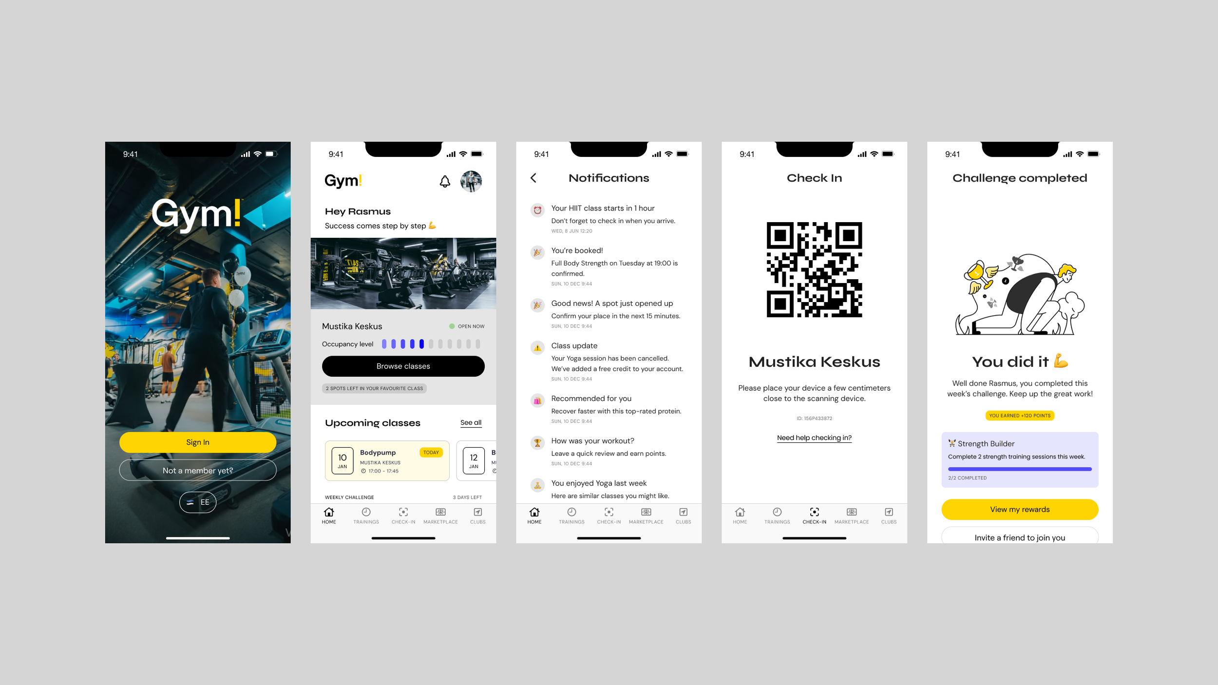 In 2020, I initiated a redesign of the Gym! app (a fitness franchise present across Estonia, Latvia, and Lithuania) after identifying clear usability and engagement gaps in the existing experience. While the app provided essential functionality such as class booking and membership access, the overall structure felt fragmented and transactional. Key features lacked hierarchy, navigation required unnecessary effort, and the product did little to support long-term motivation or habit formation. I saw an opportunity to transform it from a utility tool into a more holistic fitness companion.